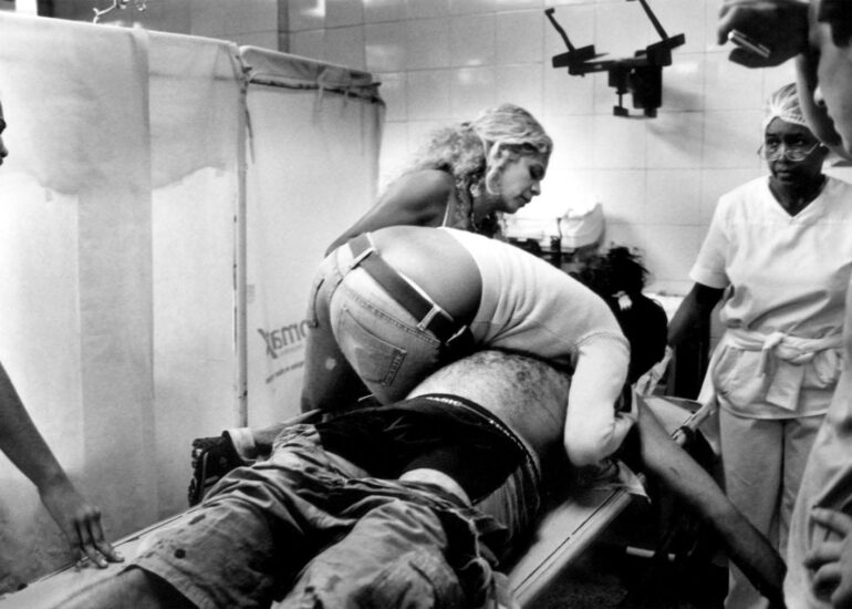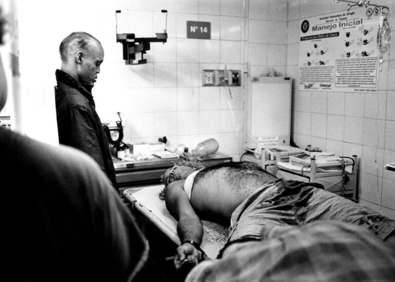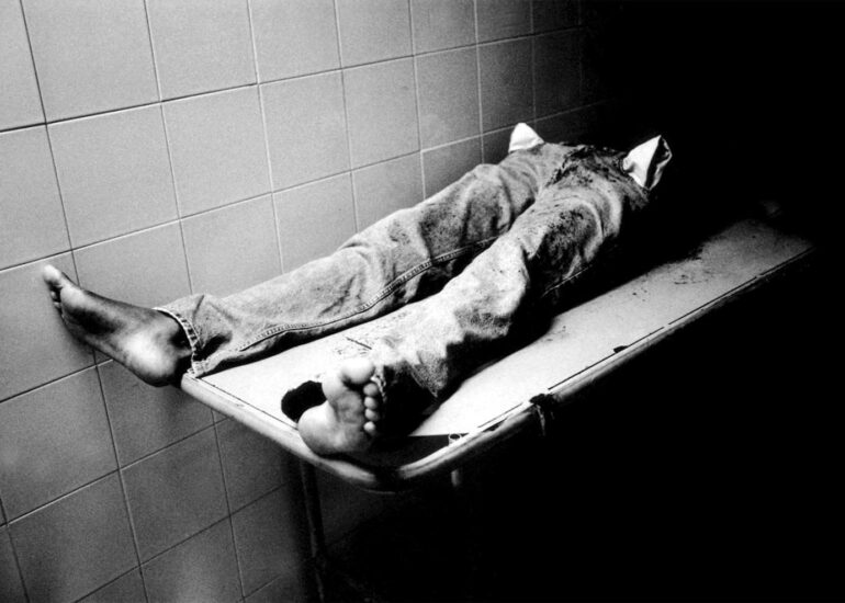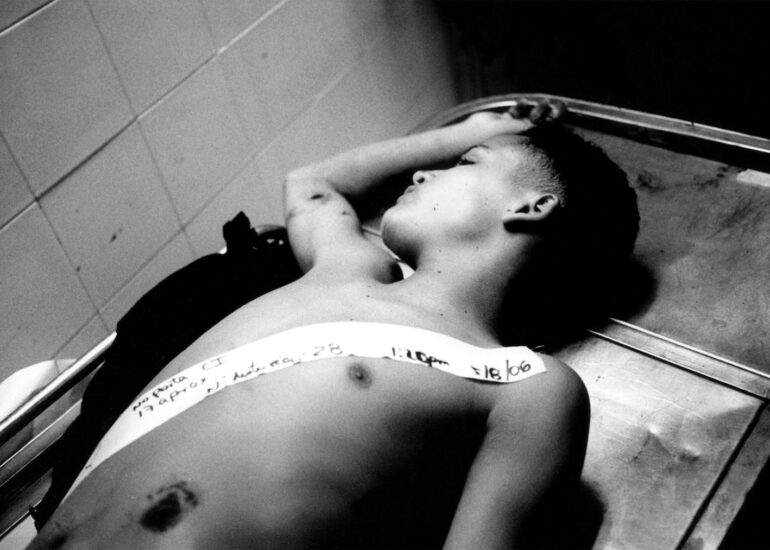 A mother spits at us: “around here they murder us every night, there’s no life to be had”. As little life as there is in the final few pictures of your book, where a seventeen-year-old boy is found slaughtered with seven bullet wounds. Meanwhile the gang members jolt down the hill carrying the coffin of their dead comrade-in-arms (because the gangsters are forbidden from holding wakes for their own dead within the fortress), chanting the Colombian vallenato song…